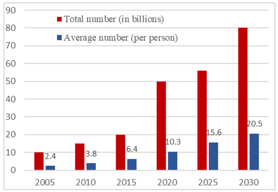 Numerous studies have investigated next-generation mobile communication network technologies, such as network architectures, communication protocols, information security and smart applications [1,2]. The performance of Internet of Things (IoT), in which connected devices transfer sensor data over the internet, is a key consideration in the development of fifth-generation (5G) networks. At the dawn of the era of 5G communication networks in 2020, the number of connected IoT devices had already reached 50 billion; each person had an average of 10.3 connected devices (Figure 1). By 2030, the number of IoT device nodes is expected to grow to 80 billion, and each person is expected to have an average of 20.5 connected devices [2].