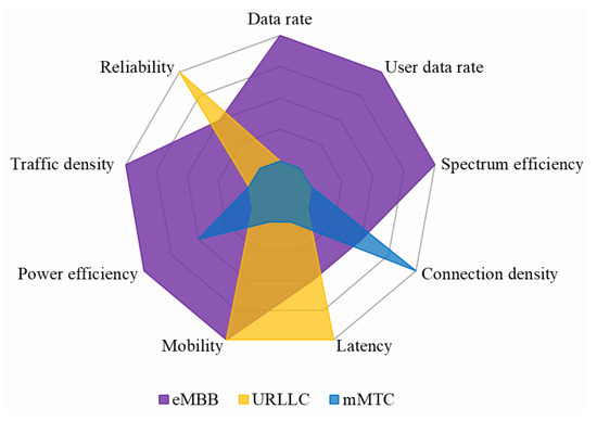 The International Telecommunication Union Radio-communication Sector divided 5G communication services into three categories: mMTC (massive machine-type communication), URLLC (ultra-reliable low-latency communication) and eMBB (enhanced mobile broadband) [3,4]. Figure 2 displays the nine service quality requirements, such as latency, and the corresponding importance of these requirements for each of the three categories, as indicated by the length of the radial bars [5]. mMTC and URLLC have two extremely different service quality requirements of scalability and reliability with low latency, respectively. Fifth generation and future communication networks should be able to integrate heterogeneous services with different latency requirements, reliability scores, and data transfer rates in an environment with shared network infrastructure instead of providing individual network solutions for each service type. In other words, a communication network designed for IoT devices alone is unsuitable for supporting heterogeneous services in a shared network environment.