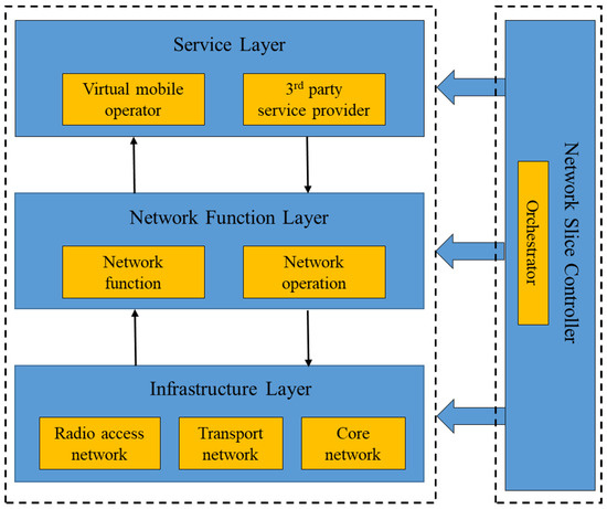 Fifth-generation network slicing (NS), a technology for integrating multiple heterogeneous services in a shared network infrastructure, is expected to be widely used in future networks. In NS, virtualization is used to slice a physical 5G network into multiple isolated end-to-end (E2E) logical networks of varying sizes and structures that are dedicated to different use cases. The equipment, access, transmission, and core network of each virtual network (i.e., network slice) are independent [5,6]. By using network slices, companies could ask internet service providers to provide a customized 5G network. For example, hospitals, with high security and reliability requirements, could use a network slice that enables low-latency, high-reliability applications such as remote surgery. With network softwarization, including software-defined networking (SDN), network function virtualization (NFV) [7,8], etc., different virtual networks can serve different functions, optimizing network resources usage. Figure 3 illustrates the 5G NS architecture as left and right blocks (framed by dotted lines). The left block represents the actual slicing implementation, and the right block represents the slice management and configuration. The left implementation block is a multi-layer architecture comprising the service layer, network function layer, and infrastructure layer. The right control block is a centrally processed network unit, called the network slice controller, which monitors and manages the functions between any two of the three layers in the left block so as to efficiently coordinate the multiple coexisting network slices [5,9].