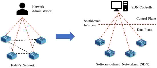 SDN is a promising technology for network softwarization for realizing 5G NS. Potential network slices can be defined in accordance with the relevant requirements of each SDN user. SDN can include artificial intelligence algorithms and provide flexible and programmable applications or services [10,11]. The Open Network Foundation [12] defined SDN as ‘The physical separation of the network control plane from the forwarding plane, and where a control plane controls several devices.’ This separation of the control plane from the data plane enables SDN to flexibly and centrally control the entire network and to quickly respond to changes in network conditions, business, markets, and user demands. The major difference between contemporary network operations and SDN is the creation of a virtualized control plane that can execute intelligent management decisions for network functions, remediating the gap between service delivery and network management (Figure 4) [13]. With an SDN, network control can be achieved directly and programmatically through a standardized southbound interface. For instance, the commonly used OpenFlow protocol [14] defines a communication mechanism between the controller in the control plane and the forwarding components in the data plane.