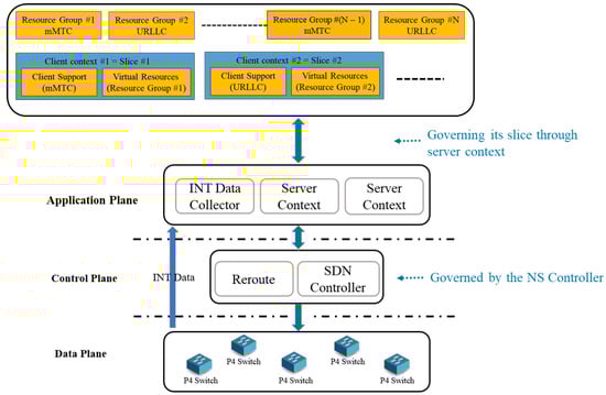 First, we present the SDNPS architecture. The client services are divided into two categories—mMTC and URLLC—which are assigned different network slices (Figure 5). Each network slice is logically independent of the other in terms of network resources, including equipment, access, transmission, and core networks. The SDN comprises three planes: application, control, and data. The SDN controller in the control plane uses client context-aware forwarding rules or server context-aware strategies to manage the network slices. The client context comprises the client identity, service quality requirements, and virtual network resources to satisfy all incoming end user requests. With INT [23], each P4 switch along a path in the data plane can directly record the network status, including the queue occupancy, link throughput, and processing delay, from an INT header added by the ingress switch before forwarding. When a data packet carrying INT data arrives at the egress switch, the INT data are duplicated and sent upward to the INT data collector module in the application plane to monitor the status of each switch on a flow path. The NS controller is responsible for changing paths and informing the reroute module of path reconfigurations. The P4 switches are activated to update the forwarding rules when necessary. The SDNPS can both reduce the burden on the SDN controller and achieve real-time control of transmission paths in network slices. Thus, both mMTC and URLLC can meet their respective service quality requirements by using 5G NS with SDN and P4 switches.