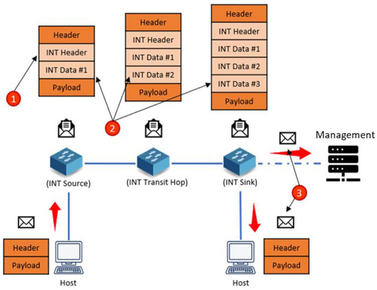 INT is a new monitoring technology based on P4. The main concept is collecting and reporting the network status in the data plane without the intervention of the control plane. In INT, network status information (for example, the switch queue occupancy, packet output rate, and processing delay) is encapsulated into a data packet or a predefined control packet by each P4 switch along a data transmission path. The packet carrying the collected network status information is extracted and sent to the application plane for further analysis prior to being forwarded to its destination. Thus, the load of bidirectional information exchange between the control plane and the data plane is considerably reduced, and up-to-date, accurate network status information in the data plane can be obtained and acted upon as quickly as possible. Figure 6 illustrates the procedure for INT. The INT source, INT transit hop, and INT sink are all P4 switching devices that support INT and represent the start, middle, and end point of a flow path, respectively. As shown in Figure 6, the INT procedure is divided into three steps: