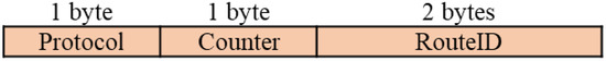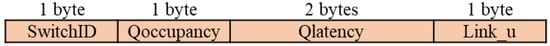 Among the above Metadata, hop latency, egress port TX link utilization, and queue occupancy are used by the proposed SDNPS to manage the flow paths in the mMTC and URLLC slices. INT does not specify the packet encapsulation format. The format of the INT header and which INT data each P4 switch should write can be defined by the administrator. SDNPS writes 0 × 0801 in the EtherType field of the Ethernet header to identify if it is a P4 switch (Figure 7). If it is a P4 switch, the field ‘Flow_h’ follows the EtherType field. Flow_h (i.e., Flow Header) is mainly used to inform P4 switches as to whether the forwarded packet contains INT data because the INT data for each P4 switch are sent only periodically—not with every data packet. Figure 8 presents the format of the 4-byte flow header (denoted as Flow_h), comprising Protocol (1 byte), Counter (1 byte), and RouteID (2 bytes). The Protocol field is set to 0 × 00 and 0 × 01 in our framework to identify whether the data after the Flow Header are an IP header or INT data, respectively. The Counter field records the number of P4 switches a packet passes through; each P4 switch adds one. The RouteID is configured in accordance with the source IP and destination IP. Each RouteID is unique and indicates a flow path; packets containing INT data include these data from each P4 switch along the flow path indicated by the RouteID. Figure 9 presents the format of the 5-byte INT data (denoted as INT_h) for a P4 switch, comprising SwitchID (1 byte), Qoccupancy (1 byte), Qlatency (2 bytes), and Link_utilization (1 byte). The SwitchID field is used to record the identity of the switch, the Qlatency field is used to record the processing time, the Qoccupancy field is used to record the utilization ratio of the egress queue, and the Link_u field is used to record the bandwidth utilization of the egress link.