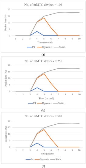 Figure 11 shows the average packet loss ratio versus time for the URLLC slice. Figure 11a–c display the results for 100, 250, and 500 mMTC devices, respectively. The first flow path (i.e., S1-S3-S5-S6) in the URLLC slice with 5 Mbps of initial URLLC traffic becomes overloaded at 3 s when 17 Mbps of URLLC traffic are transmitted through the flow path. Figure 11 reveals that the average packet loss ratios with SDNPS (blue curves) always reduce to near zero more quickly after the third second than with the conventional SDN with either static (grey curves) or dynamic routing (orange curves), regardless of the total load of mMTC devices. This result occurs because with SDNPS, the INT data for each switch are carried by a data packet every 0.5 s, extracted at the egress switch, and sent to the network slice controller, enabling a rapid response to network congestion. The NS controller thus quickly decides to reroute the 17 Mbps URLLC flow to the second path (i.e., S1-S3-S4-S6) in the URLLC slice. By contrast, for the conventional SDN with dynamic routing, updating the forwarding rules for the switches in the data plane requires substantial information exchange between the SDN controller and every OpenFlow switch; thus, rerouting requires more time. For the conventional SDN with static routing, the average packet loss ratio is increased continuously after the third second because the forwarding rules do not change in the static routing unless the current path fails.