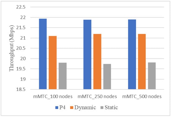 Figure 12, Figure 13 and Figure 14 show the average throughput, packet delay, and packet loss ratio in the URLLC slice for 100, 250, and 500 mMTC devices. Because URLLC and mMTC are differentiated by NS, the number of mMTC devices does not affect the performance in any of the scenarios. Thus, the behavior of the mMTC slice does not affect that of the URLLC slice because the network slices are inherently independent of each other. However, in all scenarios, SDNPS exhibits considerably better performance in all metrics than do the other two schemes.
