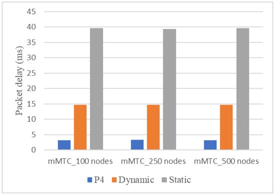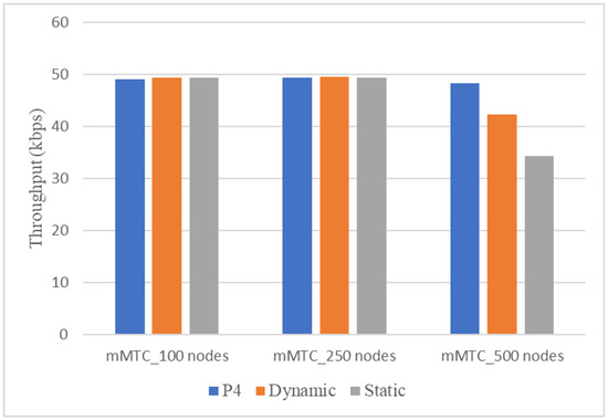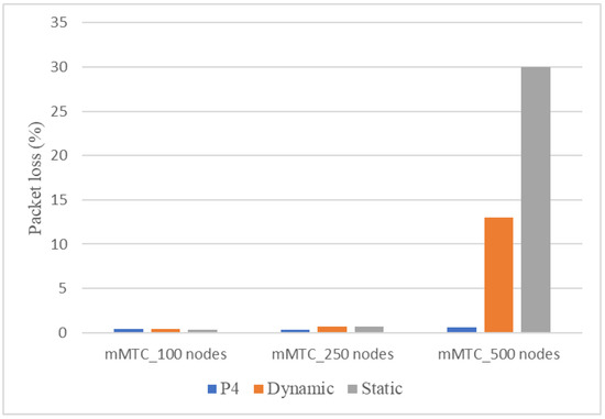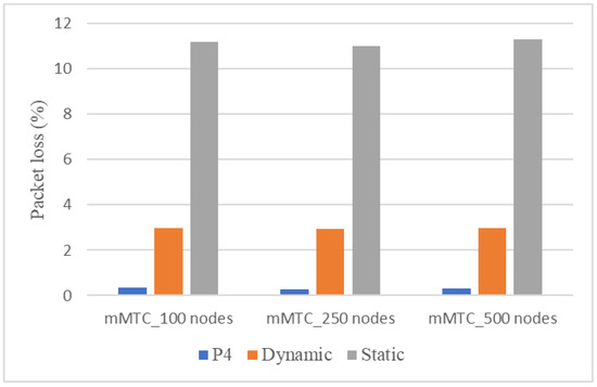 The key service quality requirement for mMTC is connection density, and the least significant service quality requirement is latency. Figure 15 and Figure 16 show the average throughput and packet loss ratio per node, respectively, versus the number of mMTC devices. Figure 15 reveals that the average throughput per mMTC node with SDNPS (blue bars) is approximately equal to the packet generation rate (i.e., 50 Kbps), regardless of the number of nodes requesting connections. However, a slight reduction in throughput is observed for 500 nodes (i.e., heavy load) because processing time is required for path changes for some connections in the mMTC slice. SDNPS outperforms both the dynamic or and static SDNs, especially under heavy load in the slice. Thus, SDNPS achieves higher connection density. Similarly, Figure 16 reveals the superiority of SDNPS over the other two schemes in terms of the average packet loss ratio per mMTC node.