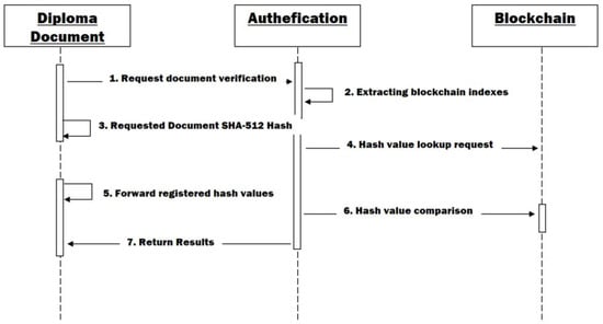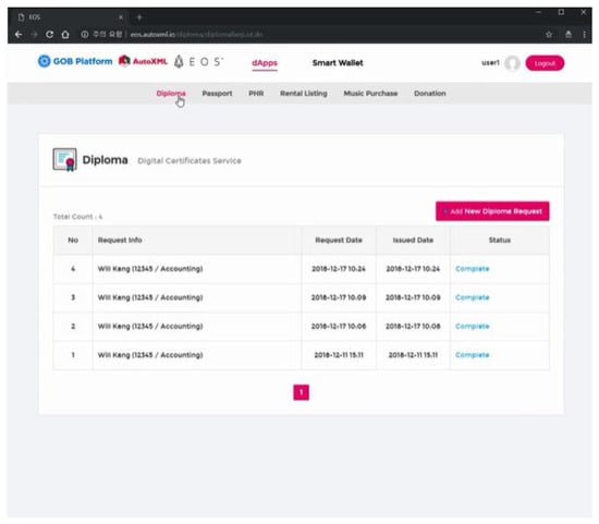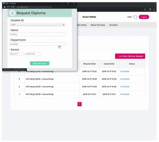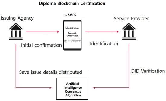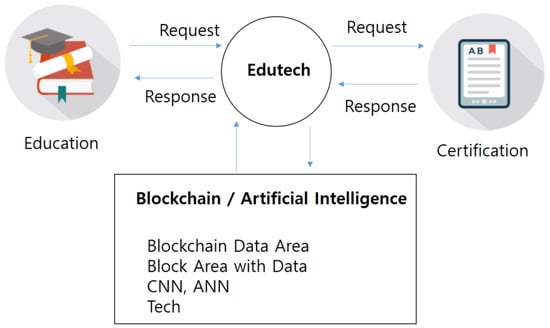 EduTech combines education and technology to develop eLearning from a diverse perspective. This term eLearning means learning by utilizing electronic means, information and communication, and radio and broadcasting technologies, and it has developed into a means of overcoming the evils of existing offline education, i.e., collectivity and cramming. eLearning includes electronic learning based on the internet, web learning, web-based training, online learning, and remote education and interactive teaching and autonomous learning. Therefore, eLearning is a knowledge service industry that combines Information and Communication Technology (ICT) and education and is evaluated as a new growth engine for high value-added products. Moreover, eLearning provides learners with various learning content, access to information, time-saving, and enjoyment, thereby creating new value for learners [8,9,10,11,12]. With the spread of mobile internet-based smart devices, eLearning learners are enjoying learning on subway trains, buses, cafes, and even restrooms while downloading eLearning applications. In other words, eLearning is an efficient, self-directed learning method that can significantly reduce the time and space constraints and increase the learner’s educational effectiveness. In addition, one of the key features of video learning through eLearning is that learners can learn anytime, anywhere. Additionally, because of its strong learner initiative, it can exercise its right to decide on the learning methods and progress. EduTech refers to the interaction between education and technology by combining existing education and technology. There are several features that correspond to self-directedness in eLearning. With the rapid development of Edutech, these technologies are being applied from elementary school to university. After eLearning and regular school courses, however, diplomas and certificates are likely to be forged. Figure 1 shows how Edutech is used to verify diplomas and transcripts.