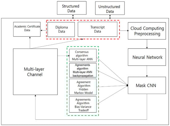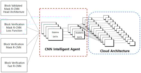 Nowadays, many students are going abroad to study. This phenomenon is caused by globalization. Still, it is quite difficult to know the school situation in other countries even if a student studies abroad. Currently, many schools are trying to avoid issuing these academic certificates online even though it is possible because the technology has improved. In the past, a student had to go to the school that he/she used to attend in order to obtain a diploma and a transcript [36,37]. Now, however, it is issued through the internet. Still, the number of cases of forgery is increasing when these internet proofs are made. In this study, we try to prevent the falsification of certificates such as these and to ensure that all certificates are safely verified and issued between individuals in the future. The study also uses a methodology that checks the similarity of certificates with the artificial intelligence’s Mask CNN and also verifies them in a sucker using a Blockchain. Finally, we will study the block node and deep learning Mask CNN techniques [38,39,40,41,42].