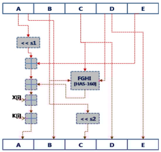 Both the MD5 and HAS-160 hash algorithms consist of four rounds, but the stages of each round are different. Each round of the MD5 consists of 16 stages, while the HAS-160 consists of 20 stages. As mentioned earlier, the two hash algorithms receive input and process in 512-bit increments, but for the final output, MD5 outputs 128 bits and HAS-160 outputs 160 bits. In addition, for the initial value, the number of bits equal to the output bit can be used as the initial value, so MD5 uses 128 bits, whereas HAS-160 uses 160 bits. However, one feature here is that the default initialization constant values of the four 32-bit bits use the same values in the two hash functions. For HAS-160, additional 32-bit initial values are provided only. In addition, 512 bits are represented by 16 32 bits. Additionally, the 16 32-bit values provided as inputs are accessed from the hash function. In this case, the MD5 hash function is randomly accessed while performing step 64 out of 16 input functions. However, in the case of the HAS-160 hash function, four additional input values are generated and used for each round. This reduces the complexity of implementing round functions by pre-generating a total of 16 additional inputs (four rounds × four = 16 pieces) to be used when receiving 512-bit inputs in the diploma security algorithm, storing them in dual port memory, and providing them when performing round functions. The MD5 and HAS-160 seawater algorithms have FGHI(a) functions. It can be seen that the FGHI(b) function uses different functions for each round, but the MD5 and HAS-160 hash algorithms use similar Boolean functions. The integrated hash algorithm does not require eight Boolean functions, and if you share a common Boolean function, you can provide five Boolean functions. This is a summary of the FGHI(c) Boolean function of the MD5 and HAS-160 hash algorithms and the constant values used in each round. In the case of constant values, MD5 requires 64 because different constant values are used for each step, and in the case of HAS-160, only four constant values are required because the same value is used per round. The following is a summary of the left-hand rotation used in the single-step operation of the two hash algorithms. The left-hand rotation used by the MD5 hash algorithm uses four values in each round, which are repeated. Additionally, in the HAS-160 hash algorithm, 20 values are repeatedly used four times in the case of S1, and in the case for S2 (Figure 4).