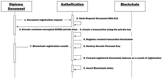 Diploma e-document authenticity service refers to the process of registering a document’s hash value with a Certificate Authority (CA) agency or a third party company, receiving the result value, and inserting it into the original document. The agency should receive the document’s fingerprint value, store it on a highly secure, independent storage, and return the only corresponding value. However, if the document’s fingerprint value is entrusted to a CA agency or a third-party company, it becomes dependent on the agency or company. This is because the institution creates a Token value corresponding to the document fingerprint value and uses the value to verify its authenticity. In addition, it is difficult to register documents and verify documents in the future because foreign users must subscribe to the service in Korea to use the service. By providing this service based on Blockchain, any company dependence can be avoided if only the hash function of document fingerprinting can be shared. Furthermore, for document fingerprint registration and document verification, only Blockchain needs to be accessed simply, thus securing internationality. In order to organize this service based on Blockchain, the extracted document fingerprint value is registered on the Blockchain and the Blockchain index (TXID) is submitted as a result, so that it can be inquired on the Blockchain, as shown in Figure 5.