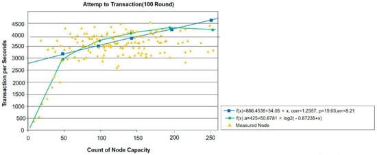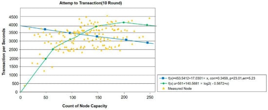 Table 4 compares the performance between VISA and the existing Blockchain platform and expresses it as a percentage. Based on this, it can be seen that the maximum acceptance TPS of the Ethereum platform used by the majority of DApps is about 30 TPS, which shows 0.125% performance compared to the most representative VISA among financial services, and only 15% performance compared to PayPal. Considering that PayPal is a single fintech service, the performance of Ethereum, a driving platform for various DApps, will be further evaluated. On the other hand, the maximum TPS of DApp, the system presented in this study, was 4000. It was verified that the platform under evaluation showed at least 50 times more performance than the maximum TPS of Ethereum’s entire chain based on the maximum TPS of a single DApp in a commercial service environment.