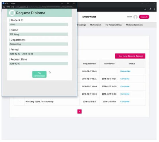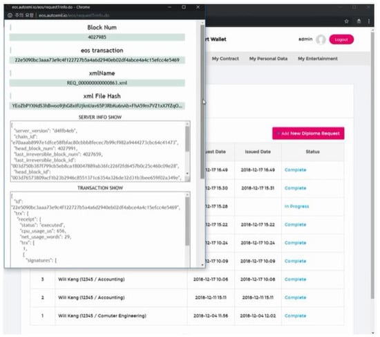 In addition, we are carrying out similarity test with artificial intelligence. Figure 20 shows a screen that is verified by requesting the original diploma and the Blockchain diploma that has been verified. First of all, student ID refers to the class number. Additionally, the name value is called. Additionally, the figure shows the detailed screen where users can obtain a graduation certificate with safe certification information. Additionally, the picture is a system that can be safely certified as a smart country through smart wallets. In this way, users will obtain a safe and verified graduation certificate. Additionally, the screen updates personal ID, name, search period, and verification time by searching based on actual artificial intelligence-based Blockchain Request ID.