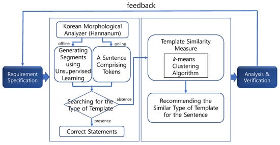 The overall validation process used to prove the correctness of a requirement specification is depicted in Figure 1. When offline, the unsupervised clustering techniques are utilized as a tool to classify a tapestry of sentences into groups (called “clusters”). When online, in the event that a specific input sentence does not belong to one of the templates, the k-means clustering algorithm [,,,] should recommend a template that closely resembles the syntax of the input sentence.