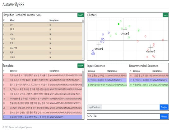 An actual screen capture of our system is depicted in Figure 3. As shown in the upper-left part of our system, a set of STK is saved into a database and is loaded from a database that is connected to the GUI on the Web server with the RESTful API. The database of domain-specific templates, which is also connected to the GUI, is displayed in the lower-left part of Figure 3. After the STK and templates are loaded, the k-means algorithm divides the templates of requirement specifications into clusters. The k value should be determined by unsupervised clustering algorithms, i.e., EM and DBSCAN, as mentioned in Section 3.1. The distribution of instances in clusters and their centroids is depicted in the upper-right part of Figure 3. To check the soundness of a requirement specification, users can key in a single sentence in Korean; then, our system returns an identical template if the input sentence exists in the template database. Otherwise, it returns the most similar template that can be used to correct the input sentence. Users could also process the file of sentences with a period in each line, as shown in the lower-right part of Figure 3.
