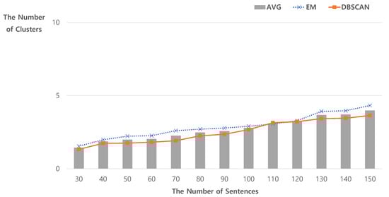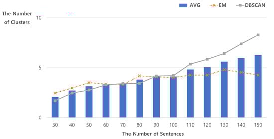 To find the appropriate number of clusters for the sentences, the EM and DBSCAN algorithms, as unsupervised clustering techniques, are utilized. The EM algorithm is provided by weka.clusterers.EM of Weka Workbench [] and python-weka-wrapper3 . The DBSCAN algorithm is provided by sklearn.cluster.DBSCAN of scikit-learn [] , whose critical parameters are as follows: the epsilon () is and the minimum number of samples (minPts) is 3. An instance of these algorithms is given by the sequence of morphemes, which is the output of the Korean Morphological Analyzer, Hannanum, whose maximum length is set to 100 tokens. A total of 150 sentences as templates were tested in this experiment.