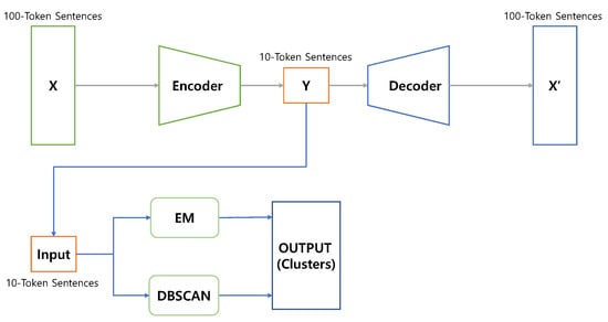 The approach presented in this paper proposes an efficient method to deal with sparsity caused by null attributes. Figure 5 shows an encoding and decoding procedure [], which uses the AutoEncoder model within TensorFlow on Python. It also presents an unsupervised clustering process, which uses the EM and DBSCAN algorithms. The encoder, as shown in Figure 5, transforms a 100-token sentence into a 10-token sentence. When an instance of a 10-token sentence is fed into learning techniques in a dimensional reduction format, each clustering algorithm is trained to divide a set of 10-token templates into separate clusters.