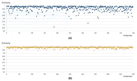 The resulting performance of the k-means clustering algorithm using the cosine similarity metric was also measured for 500 instances, as shown in Figure 8b. The cosine similarity metric measures the similarity between the newly created input instance and a specific template; when the value is closer to 1, the inputs are more similar to the templates. The distribution of similarities using the cosine similarity metric is summarized as follows: the minimum is , the maximum is , and the average is . In comparison to the experiment that used the Euclidean distance metric, the experiment using the cosine similarity metric showed better performance, where the results ranged from to , as depicted in Figure 8b. Since the average similarity achieved using these two metrics was over , we demonstrate that our framework successfully recommends templates that are highly similar to the syntax of the input sentence.