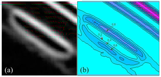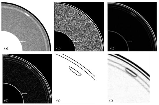 Thus the segmentation of edges and noise in high frequencies is enabled in practical processing based on thresholding operations to the mode maxima of the wavelet coefficients []. As a result, the edges and noise are perfectly segmented, but the continuity of the extracted edges is poor. The edge detection results based on wavelet mode maxima are shown in Figure 1e.