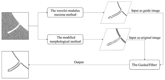 A guided filter is essentially a local linear model requiring the input of the guide image I and the original image p and outputting the filtered image q []. The guided filter-based algorithm flow is shown in Figure 2.