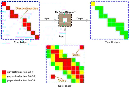 ak and bk are actually calculated with the optimization goal of keeping the outputs q and I approximately the same. The optimal convergence of type I edges to type II edges can be achieved using the guided filter. As a result, the final edges have both continuity and single-pixel response. The edges after convergence are defined as type III.