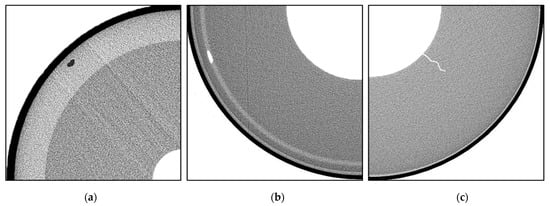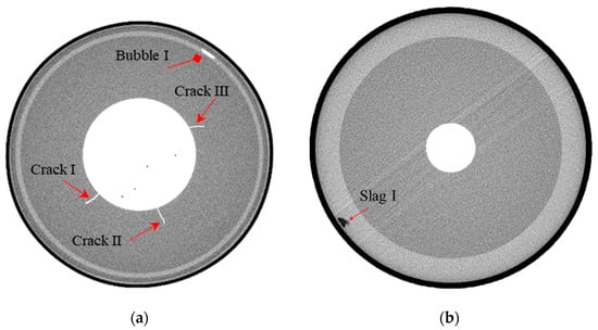 Solid rocket motors (SRMs) serve as power devices for some aircraft and various long-range rockets. The structural integrity of SRM propellant has always been the focus of attention. Cracks, slags, and bubbles are easily generated during propellant production, while cracks and bubbles are easily generated during storage and transportation []. Since all these defects seriously affect the durability and reliability of SRMs, determining their type, location, and size in the propellant is important for structural integrity analysis. Industrial computerized tomography (ICT) has been applied in the nondestructive testing of SRM propellant as it provides clear cross-section images [].