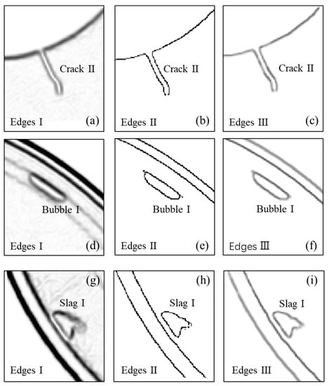 Type I, II, and III edges of typical defects are presented in Figure 6, where (a), (b), and (c) shows type I, II, and III edges of crack II; (d), (e), and (f) shows type I, II, and III edges of Bubble I; (g), (h), and (i) shows type I, II, and III edges of Slag I. The quality of type III edges with each type of defect is higher than that of type I and II edges, which aligns with the desired goal of better continuity and better noise reduction.
