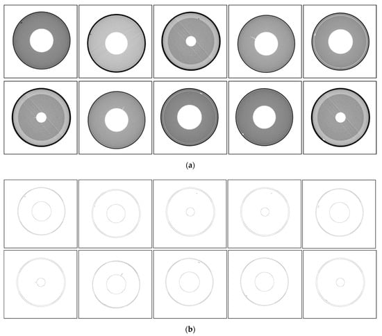 Edge detection methods have matured over the years and can be broadly divided into traditional and deep learning-based models. Traditional edge detection methods are mainly based on the operational implementation of the spatial and frequency domains of the images, which include the Sobel detector [], the Canny detector [], and the wavelet transform-based detector []. Despite their advantages in noise reduction, single-pixel response, and edge continuity, not all of these can be taken into consideration. Edge detection methods based on deep learning include holistically-nested edge detection (HED) [], CSCNN [], DeepEdge [], and DeepContour []. Since convolutional neural networks (CNNs) can automatically extract image features after training [,], edge detection methods based on deep learning have become a research hotspot in recent years. However, CNN-based edge detection methods often have low detection speeds ranging from several seconds to a few hours [], even with the help of modern GPUs. The large data volume of SRM propellant ICT images poses a challenge for the training of CNNs []. Deep learning-based edge detection methods often employ multi-scale and multi-layer feature learning to extract more comprehensive edge information and combine the outputs from multiple scales through training on the last fusion layer []. As a result, the single-pixel response at the edge of the image becomes difficult. Hence, the existing edge detection algorithms are not well adapted to the SRM propellant ICT images.