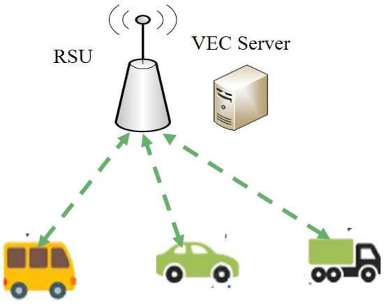 In this section, we first overview the system model and then show the formulated optimization problem. Consider a vehicular VEC system, which is composed of an VEC server and the number of N vehicles, as illustrated in Figure 1. The VEC server provides computational resources to process the generated data from the vehicular applications of these vehicles. We suppose that each vehicle has a vehicular application to be processed. The VEC server is deployed at a roadside unit (RSU), through which each vehicle’s application can be transmitted and processed by the edge server. All vehicles are assumed to be within the range of the RSU. The application of vehicle i is denoted by [30], where denotes the application’s data size in bits, and is the computing intensity, which means the required computing CPU cycles to finish computing one bit of the data. Let the binary value denote the application offloading strategy of the vehicle i. If the vehicle i processes its application by way of offloading using edge cloud resources, . Otherwise, .