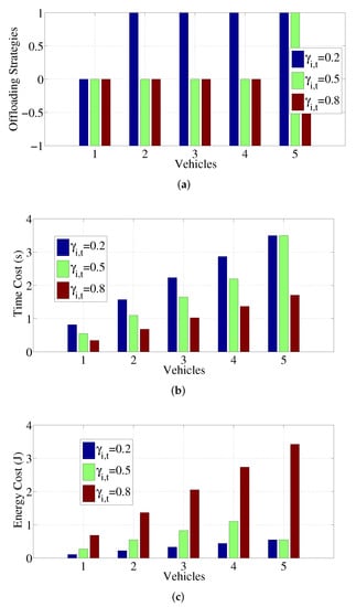 Figure 2a plots the impacts of values of weighting factors on the offloading strategies of vehicle users. In Figure 2a, when , it can be observed that vehicle users 2, 3, 4, and 5 execute their vehicular applications in the VEC server while vehicle user 1 executes its vehicular application locally. One reason is because of the fact that the data size of the vehicular application of vehicle user 1 is smaller than other vehicle users. Another reason is that vehicle users consider execution time the main factor in this situation. In Figure 2a, when , it can be found that only vehicle user 5 executes its vehicular application in the VEC server. Especially when , we find that all vehicle users execute their vehicular applications locally.