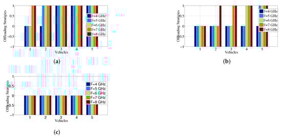 Figure 3a–c plots the impacts of the capacity of the VEC server on the offloading strategies that vehicles use, considering different values of the weighting factor. We set the vehicle number as 5 and varied the capacity of the VEC server from 4 to 8 GHz. In Figure 3a, it is observed that all vehicle users will offload their vehicular applications in case the capacity of the VEC server increases. In particular, for the vehicular applications of the vehicle users whose data sizes are larger than others, they are executed in the VEC server when . However, in Figure 3b, when , only some vehicle users will take the offloading strategies. In Figure 3c, when , all vehicle users will execute their vehicular applications in the local model. This is because the local execution time is smaller than the time cost in the offloading and execution.
