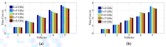 Figure 4a,b depicts the impacts of the capacity of the VEC server on the time cost considering different values of the weighting factor. We set the vehicle number as 5 and varied the capacity of the VEC server from 4 to 8 GHz. In the two figures, we see that the time cost of each vehicle user decreases as the capacity of the VEC server increases when . However, when , the time cost of each vehicle user is not necessarily decreased. This is because some vehicle users execute their vehicular applications locally, and the local time cost is more minor compared to the time cost in the VEC server.