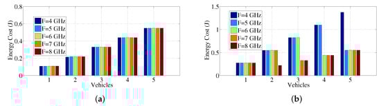 Figure 5a,b depicts the impacts of the capacity of the VEC server on the energy cost considering different values of the weighting factor. In Figure 5a, we see that the energy cost of each vehicle user will decrease with the increase in the capacity of the VEC server when . However, when , the energy of some vehicle users, such as the 2, 3, 4, and 5, will increase. This is because some of these vehicle users execute their vehicular applications locally while others offload.