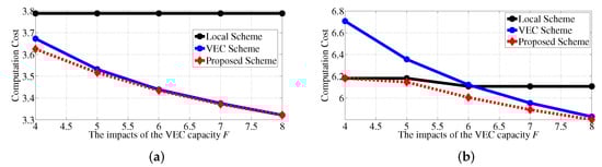 The impacts of the capacity of the VEC server on the computation cost. (a) ; (b) .