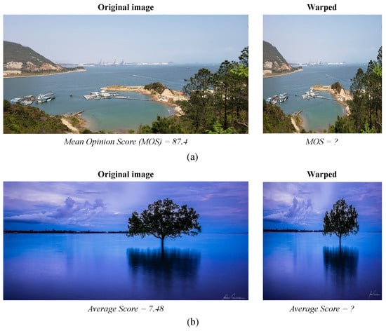 IQA can be divided into two tasks: image technical quality assessment (TQA) and image aesthetic quality assessment (AQA) [8]. The purpose of TQA is to evaluate the perceptual quality of images by measuring the degree of distortion [1], while AQA aims to infer the aesthetics of images perceived by people [2]. Since the two tasks deal with similar aspects of the people’s subjective experience on images, some recent approaches have designed a unified IQA framework to study them [9,10]. Early IQA methods mainly extract handcrafted features to train machine learning models for predicting the perceptual quality of images [11,12,13,14,15]. In recent years, the powerful feature representation ability of convolutional neural networks (CNNs) has promoted end-to-end IQA methods to achieve more notable performance [9,16,17,18,19,20,21,22]. However, since images used for model training have various sizes, these CNN-based IQA methods need to warp the input images to a fixed size (e.g., ), which destroys the composition of images or produce distortions, resulting in changes in the technical or aesthetic quality of images. For example, Figure 1 shows two original images with annotated scores as well as the corresponding images warped to a fixed size. As can be seen from the figure, warping the image to a fixed size brings different perceptual quality, and directly assigning scores to warped images for model training deteriorates its evaluation ability.