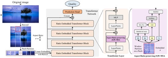 Assume that the width and height of an image are w and h, respectively. To fit the input of the proposed Transformer network, the image is resized to a fixed size (), where W, H, and C represent the width, height, and channel-wise dimension of the resized image . Hence, the original aspect ratio of the image can be computed by . In the step of patch partition, the image is split into patches , where denotes the number of patches. Then, we employ an embedding layer to feed the linearly combined image patch together with the corresponding aspect ratio r into the proposed Transformer network.