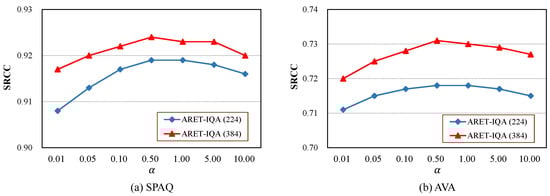 We first discuss the efficacy of a key hyperparameter, (the coefficient to control the term of the aspect-ratio-preserving position relation matrix on the computation of the multihead self-attention), in our model based on the Swin Transformer with two default input resolutions, i.e., ARET-IQA (224) and ARET-IQA (384). We set to different values and Figure 3 shows the test results (SRCC) on a TQA database (SPAQ [27]) and an AQA database (AVA [11]), where the images have various aspect ratios. As shown in the figure, we can observe that when is set to 0.5, ARET-IQA (224) and ARET-IQA (384) can achieve the best performance on both TQA and AQA databases. Specifically, when increases from 0.01 to 0.5, the SRCC values of the proposed ARET-IQA increase dramatically, which proves the necessity of introducing image aspect ratio information into the multihead self-attention of the Transformer. When exceeds 0.5, the SRCC values of our model on the two databases decrease slightly. Consequently, we set to 0.5 in all our experiments.
