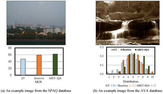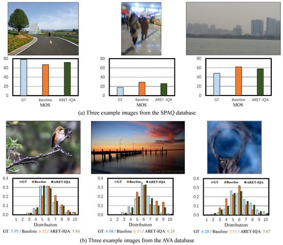 Example results of the proposed ARET-IQA (384) and the baseline model on the SPAQ [27] and AVA [11] databases. The predicted quality scores (MOS or distribution) of the baseline and our ARET-IQA as well as the corresponding ground truth (GT) are shown below each image. In the AVA database, we also show the average scores of aesthetic distribution.