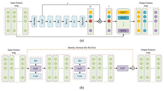 As shown in Figure 2a, the SofT module can automatically learn the appropriate value of . More specifically, the input feature map is first calculated for absolute values and global averages, which are designed to ensure that the threshold is positive while avoiding the shift variation problem during training. The expression is as follows: