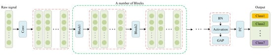Figure 2b shows a residual building unit (RBU) of the residual network (ResNet), where the conventional activation function ReLU is replaced by SofT. In fact, since the input dimension is the same as the output, the SofT can be easily embedded in any other models in addition to the RBU. Figure 2b comprises two batch normalization (BN), three SofT activation functions, two 1D convolutional layers, and one identity shortcut.