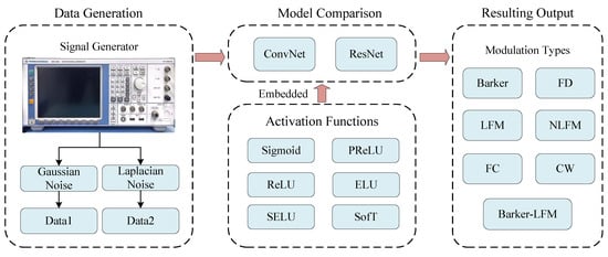 The structure of blocks in Figure 3 are the same as Figure 2b, but SofT will be replaced by each of the five activation functions mentioned above. If the block contains identity shortcuts, the model is ResNet; otherwise, it is ConvNet. The block diagram of this experiment is shown in Figure 4. Firstly, the SMU200A was used to simulate the radar emitter signals, and then two datasets representing different environmental conditions were constructed by adding Gaussian noise and Laplacian noise, respectively. Next, we constructed two models, ConvNet and ResNet, and embedded Sigmoid, PReLU, ReLU, ELU, SELU, and SofT as activation functions into the networks, respectively, to recognize the two kinds of datasets generated. Lastly, different modulation types of signals were output by neural networks.