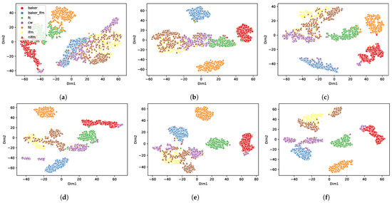 A nonlinear dimensionality reduction method, namely t-distributed stochastic neighbor embedding (t-SNE) [], was used to analyze the high-dimensional features learned by the network models. Considering space limitation, only the Gaussian noise condition was used to feed the test samples into the trained network models, and the high-dimensional features learned after the last global average pooling layer were extracted and projected into the 2D space using t-SNE for visualization and analysis. As shown in Figure 6 and Figure 7, different colors represent different modulation signals, where red, blue, green, purple, orange, yellow, and brown indicate Barker, Barker-LFM, FC, CW, FD, LFM, and NLFM, respectively. It can be seen that different types of signals were more distinguished in SofT compared to other activation functions under the same deep learning methods. For instance, in ResNet-SofT, the radar emitter signals of the same modulation type were distributed centrally, and the radar emitter signals of different modulation types were separated from each other. By contrast, for ResNet with other conventional activation functions, the 2D feature distributions of different types of signals showed high overlap because the conventional activation function cannot effectively remove noise while retaining discriminative features. Therefore, it is extremely challenging for the conventional deep learning model to distinguish different types of signals under a low SNR condition. As for SofT, the sub-network of the SofT module can learn the appropriate threshold according to the input and effectively remove the noise so that the last layer learned high-dimensional features with strong discrimination.