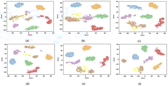 Visualization of learned features at the final GAP layer of (a) ConvNet-Sigmoid, (b) ConvNet-PReLU, (c) ConvNet-ReLU, (d) ConvNet-ELU, (e) ConvNet-SELU, and (f) ConvNet-SofT when the number of ConvBlocks equals 9 and SNR equals dB.