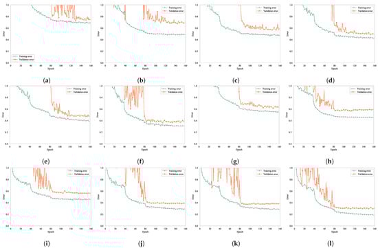 Variation tendency of errors of (a) ConvNet-Sigmoid, (b) ConvNet-PReLU, (c) ConvNet-ReLU, (d) ConvNet-ELU, (e) ConvNet-SELU, (f) ConvNet-SofT, (g) ResNet-Sigmoid, (h) ResNet-PReLU, (i) ResNet-ReLU, (j) ResNet-ELU, (k) ResNet-SELU, and (l) ResNet-SofT when the number of blocks equals 9.