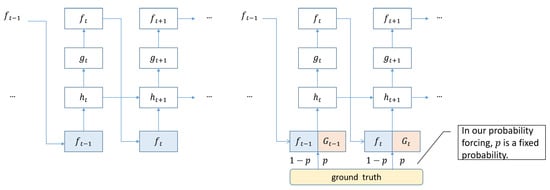 where n is an integer that can be viewed as the number of corrections, and f represents the frequency of data sampling. The probability p is a fixed correction rate, where 0 < p < 1. The ground truth is fed into the decoder as the input with a probability of p, and the output of the previous step is used as input with a probability of , as demonstrated in Figure 2.