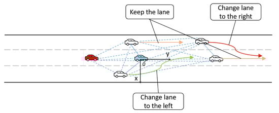 The present work uses the CAV to predict and correct the trajectories of surrounding vehicles. Following the same setting proposed by Deo and Trivedi [15], we discretize the space centered around the target vehicle into a 3 × 13 grid. The rows represent the current and adjacent lanes of target vehicle, and the columns represent discrete grid cells. Each surrounding vehicle is assigned a grid cell. As depicted in Figure 3, when a CAV predicts the trajectories of surrounding vehicles, in addition to their historical trajectories, we consider the interaction between vehicles and the lane changing behaviors of individual vehicles (e.g., change lane to right or left, or keep lanes). At the same time, the longitudinal behaviors of vehicles, including normal driving and braking, are also considered. Lane change behavior can be understood by the lane number where a vehicle is located. A 3 × 13 tensor is used to represent the lane changing behavior of the vehicle. When a value in the tensor is 1, the vehicle changes lanes to the corresponding lane. A vehicle is defined as performing a braking maneuver when its average speed within the predicted range is less than 0.75 times the speed at the time of prediction.