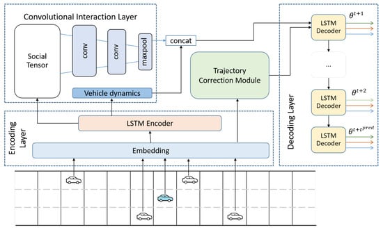 As the behavior of vehicles on a road can be highly correlated, their interactions must be considered when predicting their trajectories [36], as indicated by the blue dashed line in Figure 3. When drivers decide to perform a specific motion, they shift attention to a set of surrounding vehicles in the region, as when they pay attention to the vehicles in the target lane when making a lane change. The LSTM encoder captures the motion states of vehicles, but not their interdependence in the scene. Lee et al. [37] utilized social pooling to solve this problem, pooling the LSTM states of all vehicles in the vicinity of the predicted vehicle in a social tensor by defining a spatial grid around the predicted vehicle and populating it with LSTM states based on the spatial configuration of the vehicles in the driving scenario. In the convolutional interaction layer, a modified social pooling method [15] is used to combine convolution and social pooling. The equivariance of the convolution layer helps to learn locally useful features in the social tensor space grid, while the max-pooling layer adds local translational invariance. The social tensor is created by a lane based grid, with a 13 × 3 grid region around the predicted vehicle, where each column corresponds to a lane, each row is spaced about the length of a vehicle, and the social tensor is formed by populating this grid with the surrounding vehicle locations. Two convolutional layers and a pooling layer are then applied to the social tensor to obtain a social environment code. In addition, the LSTM state of the predicted vehicle is passed through a fully connected layer to obtain the vehicle dynamics encoding, and the two encodings are connected to form a complete trajectory encoding that is passed to the decoding layer.