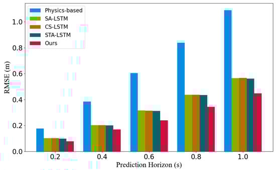 In order to make a fair comparison, we evaluated all models on the same test set. We report the RMSE for each prediction step, which is a common evaluation metric in trajectory-prediction tasks. Using the proposed model and the following comparison models: