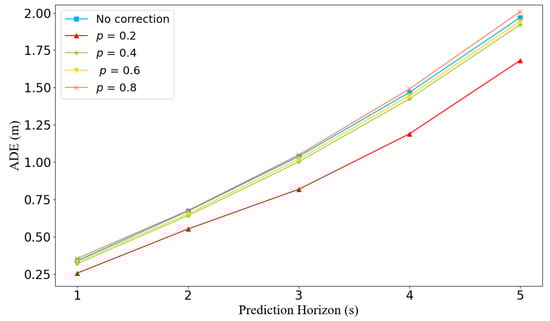 Figure 7 shows the ADE performance for different correction rates without applying and after applying correction module. The results show that the correction module is effective. When the correction rate p = 0.2, it can also be understood that it is corrected once within 1 s, and the performance is much better than the other experiments in the prediction range. Especially at 1 s and 3 s, the ADE is reduced by 24.7% and 21.2%, respectively, compared with no correction method. When p = 0.4, the ADE performance at 2 s is the best, which is 2.7% less than no correction method. When p = 0.6, the performance is also better than when the correction module is not used, and the best performance in the predicted range is also obtained at 2 s, with a 2.2% improvement. However, at p = 0.8, it is weaker, and only when 0.2 is better than without correction. We speculate that this is due to an overcorrection. It can be seen from Figure 7 that the performance does not always improve with the improvement of the correction rate, and it also shows that it is not true that the more times the trajectory is corrected, the better the ADE performance will be. By analyzing the experimental results, it can be concluded that the correction is necessary when predicting the vehicle trajectory, but an appropriate number of corrections is needed in the prediction range.