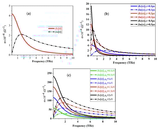Surface conductivity of graphene for (a) μc = 0 eV and τ = 0.1 ps, (b) different relaxation times at μc = 0 eV, and (c) different chemical potential values at τ = 0.1 ps T = 300 K.