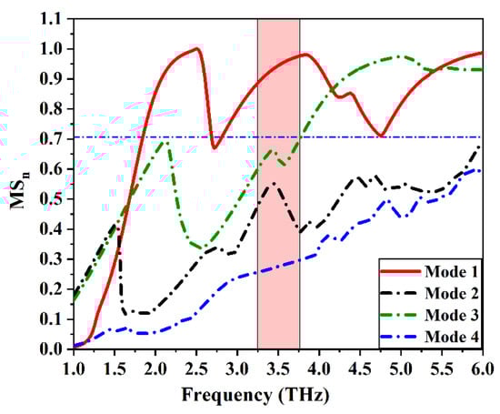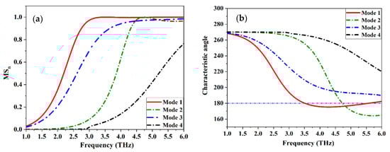 Initially, a conventional microstrip patch antenna with a graphene plasmonic layer is engraved on the top side of Teflon with a relative permittivity of 2.1, and a thickness of 10 µm. The proposed antenna is designed to resonate at 3.5 THz. The dimensions of the patch are recognized by the usage of the characteristic mode analysis (CMA) using the integral equation solver in the CST microwave studio. The optimum width and length of the patch are 32 µm and 25 µm, respectively. The single element of the patch antenna is matched to a transmission line of 50 Ω characteristic impedance using a quarter-wavelength impedance transformation. The model significance and the characteristic angel curves are shown in Figure 2a,b. Mode 1 is the resonance mode (desired mode) at a frequency of 3.5 THz in which the characteristic angle is 180° and the model significance in this frequency is the highest value (closely to unity). The validation process of the CST result can be achieved by the usage of HFSS and the equivalent circuit model using ADS software. The values of the electrical RLC components are calculated, and the electric circuit model of the antenna is developed using the circuit theory approach [35].
